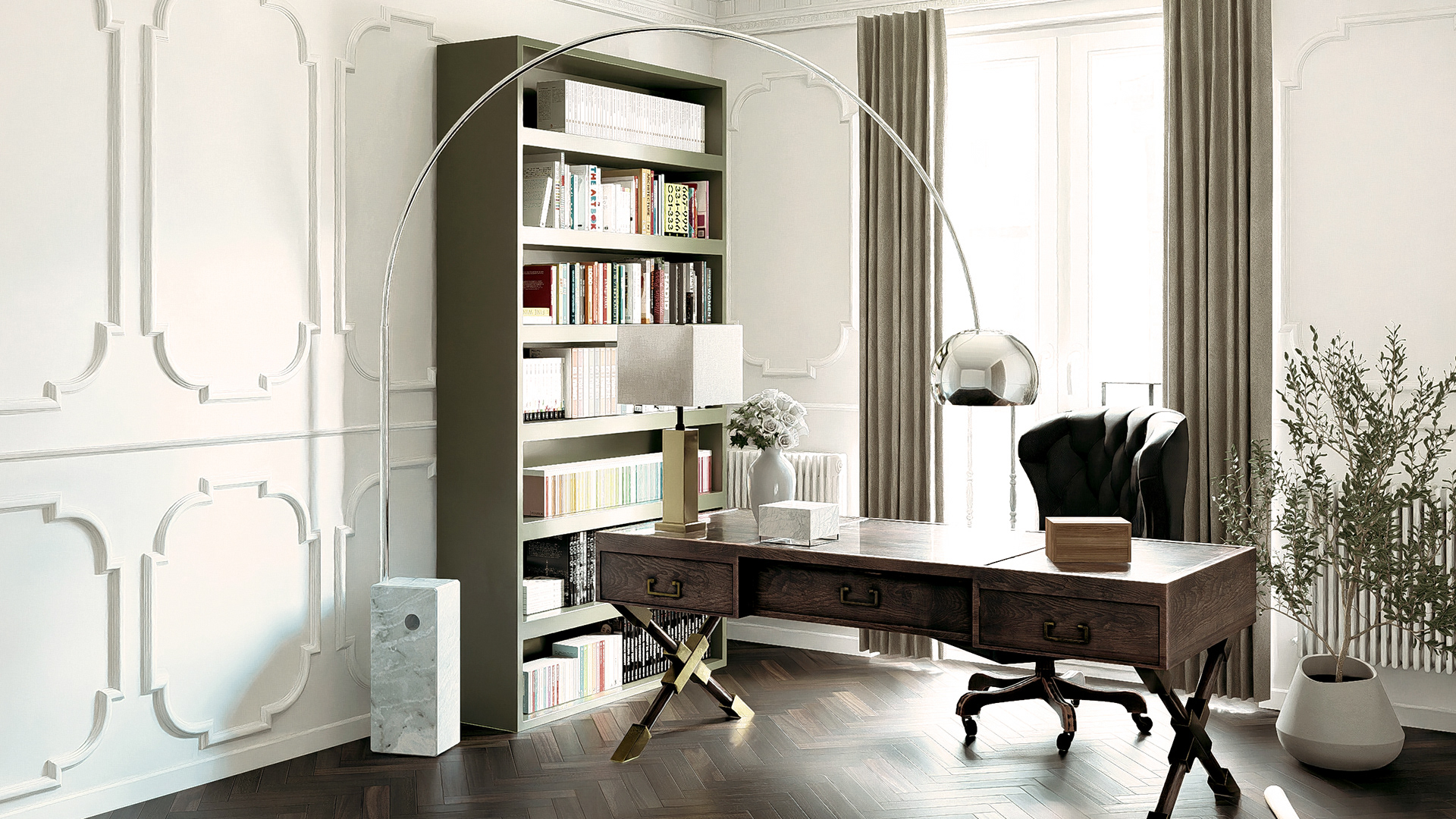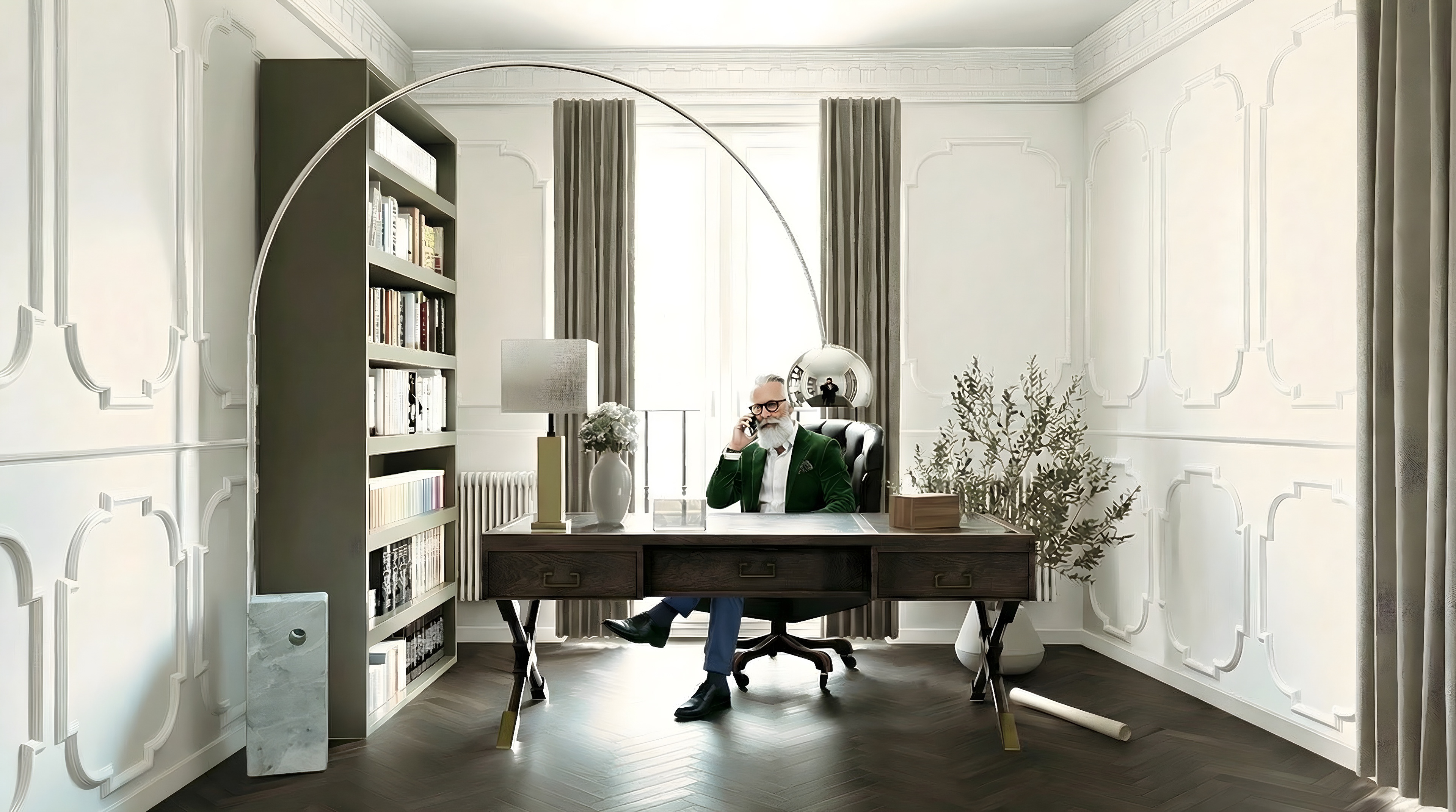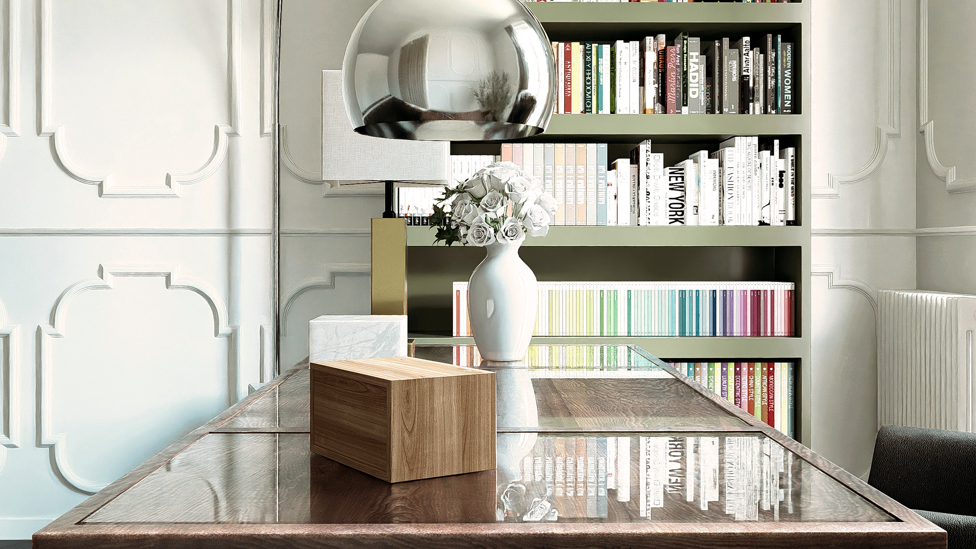Questo progetto di interior design trasforma un ufficio domestico in un ambiente di alta rappresentanza. Lo spazio è dominato da una raffinata boiserie bianca a parete, che conferisce un tocco neoclassico e sofisticato, tipico dei prestigiosi appartamenti storici europei.