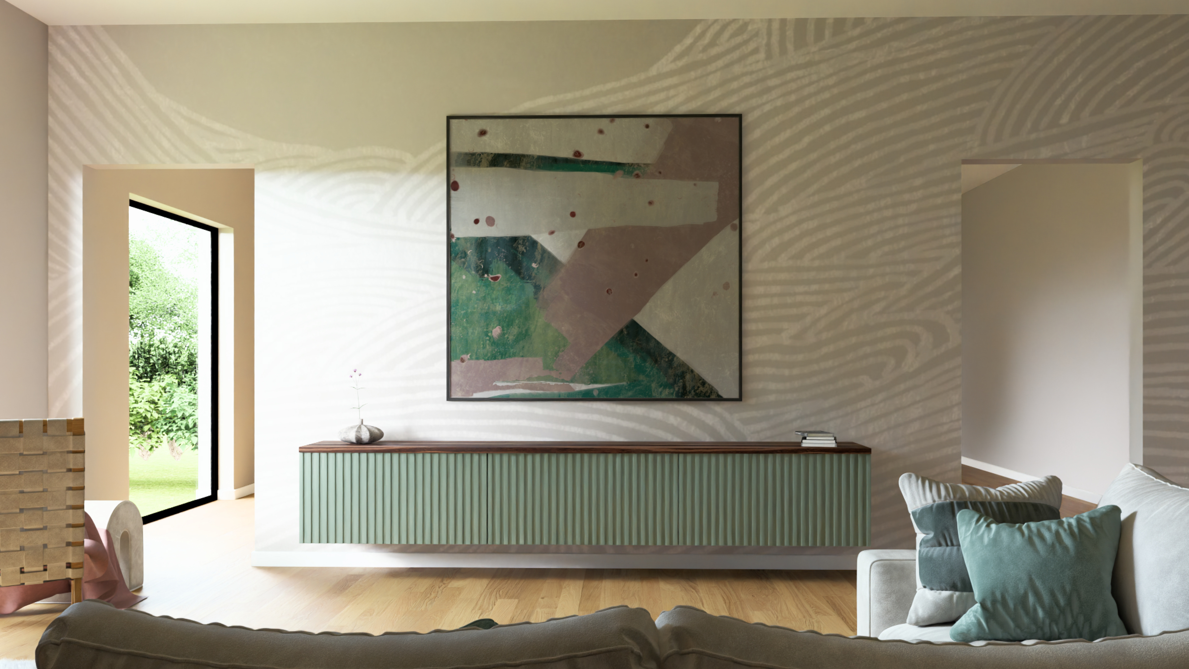 Arredamento Funzionale: Un lungo mobile sospeso in legno scuro e finiture cannettate grigio-verdi definisce lo spazio, sormontato da un'opera d'arte astratta di grandi dimensioni.