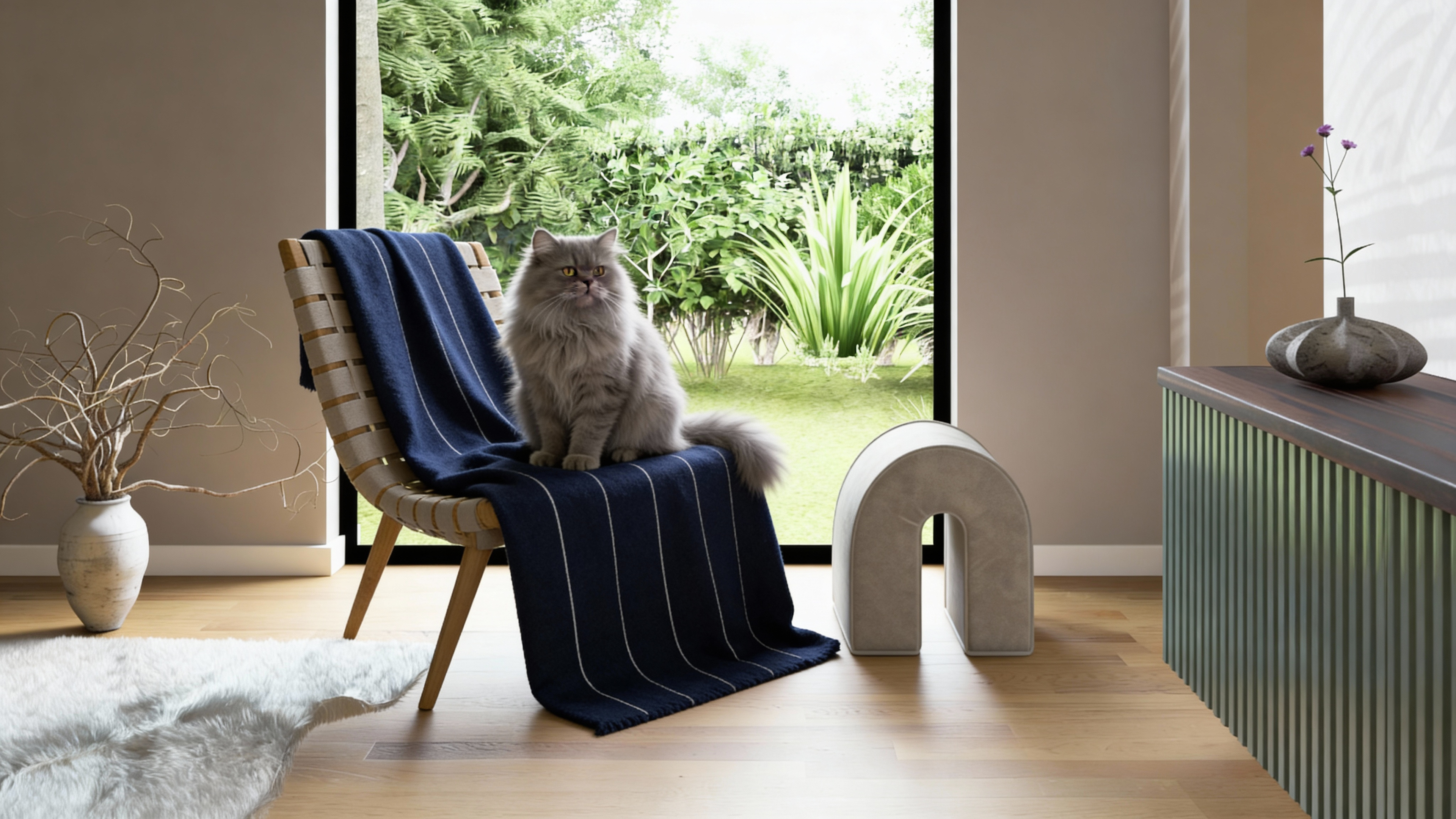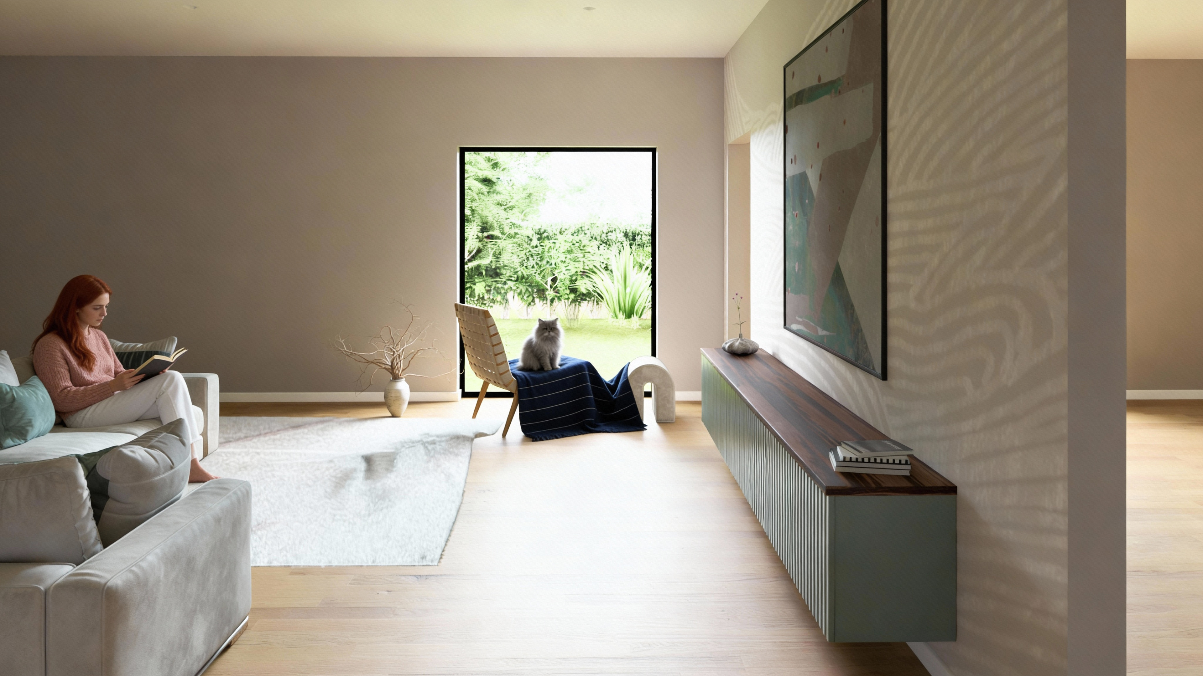 Dettagli di Stile: L'uso di tappeti materici e decorazioni minimaliste, come vasi in ceramica e rami secchi, esalta l'estetica Japandi e l'attenzione al dettaglio.